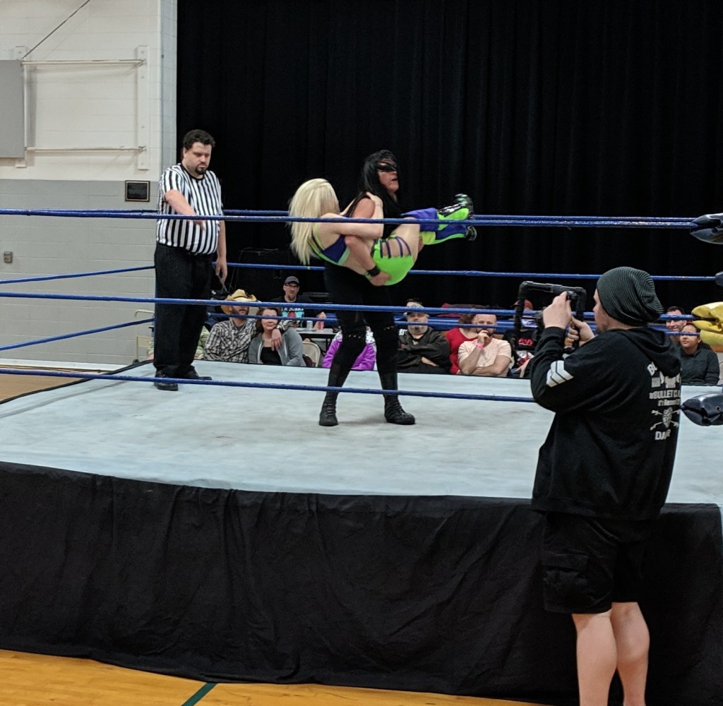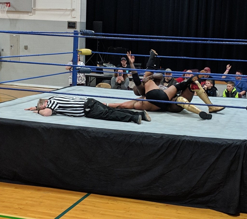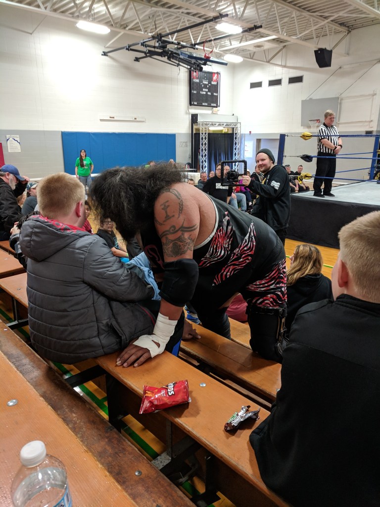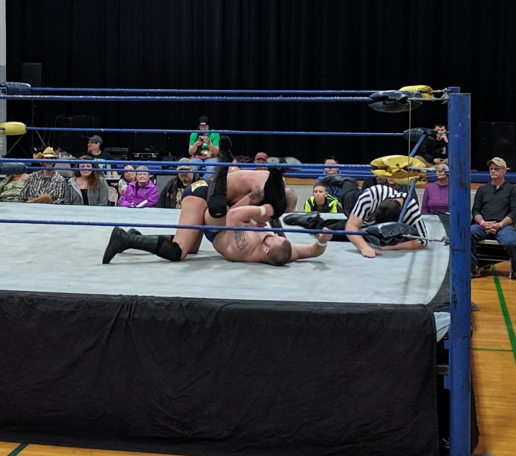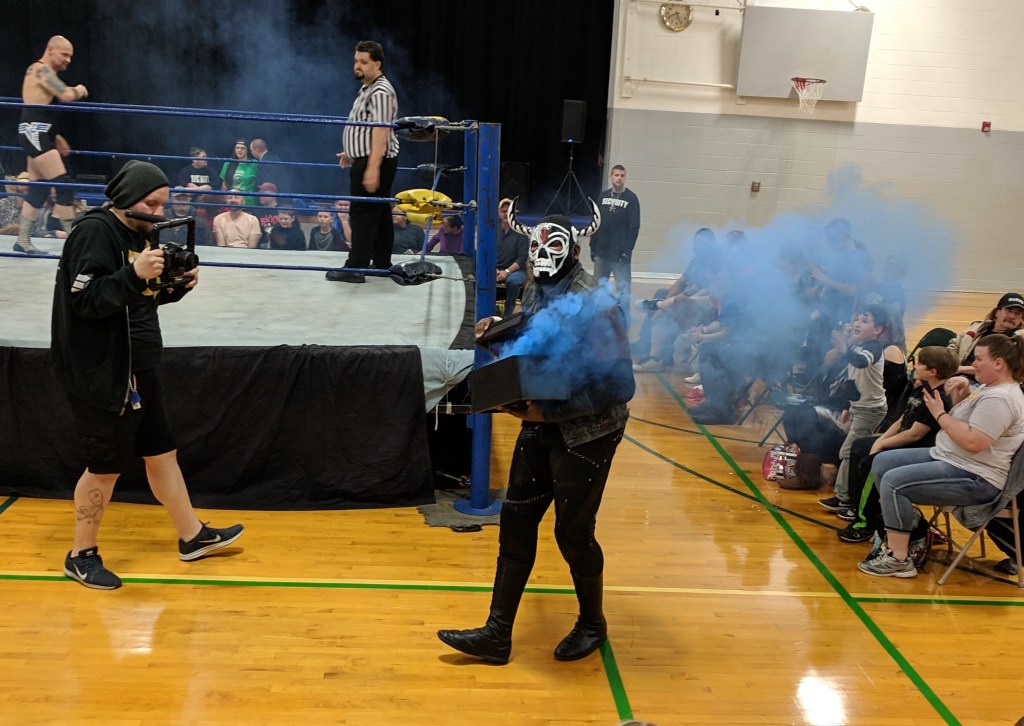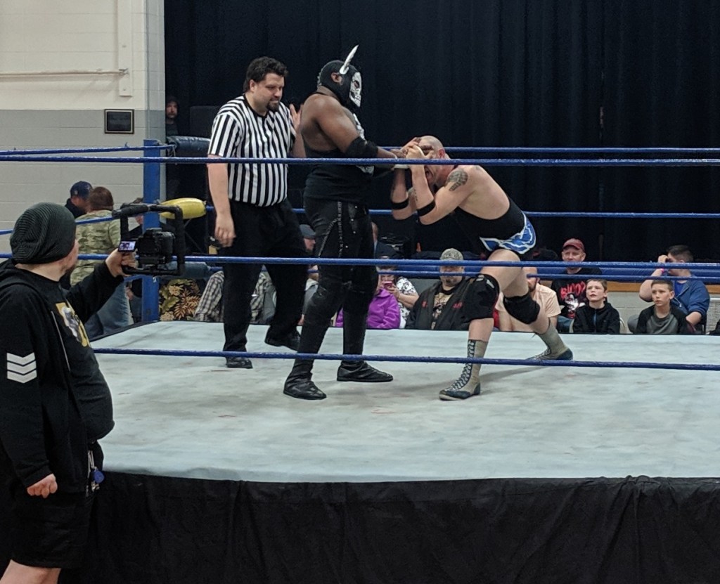 Wrestling got underway again with Dru Skillz vs. The Right Hand of God Sam Knight. As he does, Dru terrorized kids during his entrance. He also may have been hungry, as he bit Knight a lot in the match. The match ended after a low blow from Skillz, in full view of the ref who put up his hands in the “What did I just see and what am I going to do about it? … Nothing!” pose.