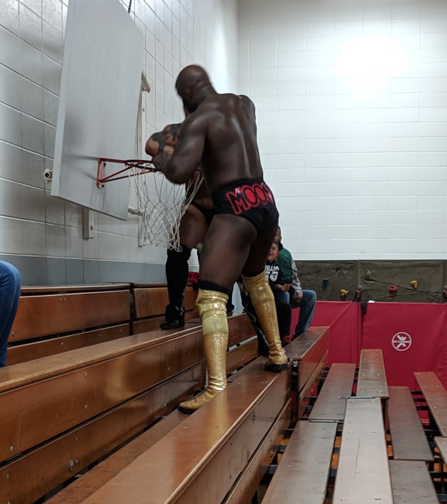 The main event was RCW Heavyweight Champion Russell Jones taking on visitor from Impact Wrestling, Moose! The two started off outside the ring, going almost all the way around the gym before finally getting into the ring – below you can see Moose about to dunk Jones’ head into a basket. I think Moose picked up some strategy tips from Dru Skillz before the match, because he was biting his opponent a lot, too. The end came when Moose dodged a kick by Jones, causing Jones to kick the ref instead; while the ref was down, Jones grabbed his title belt and whopped Moose in the head. Then Jones revived the ref enough for the three count.