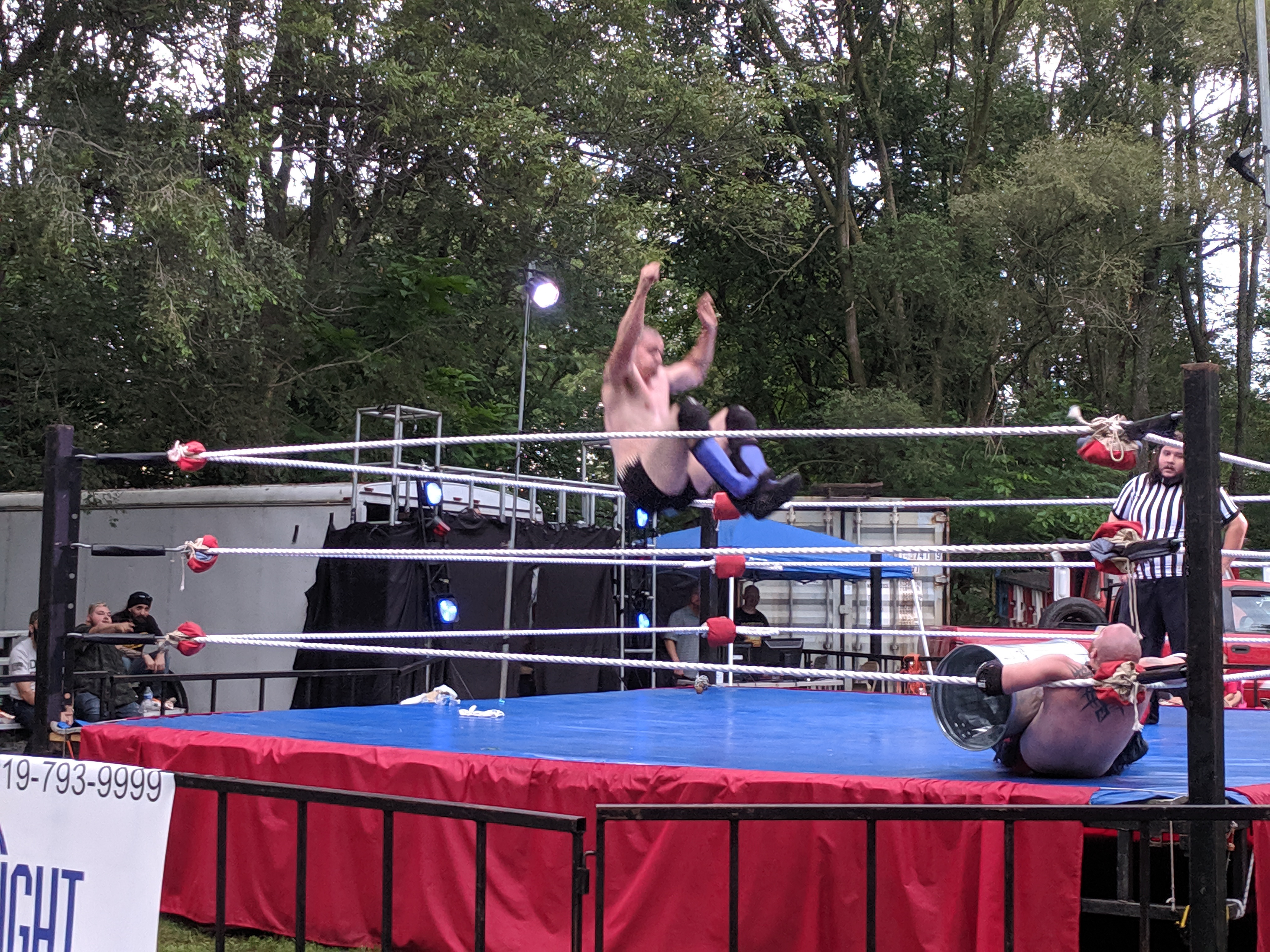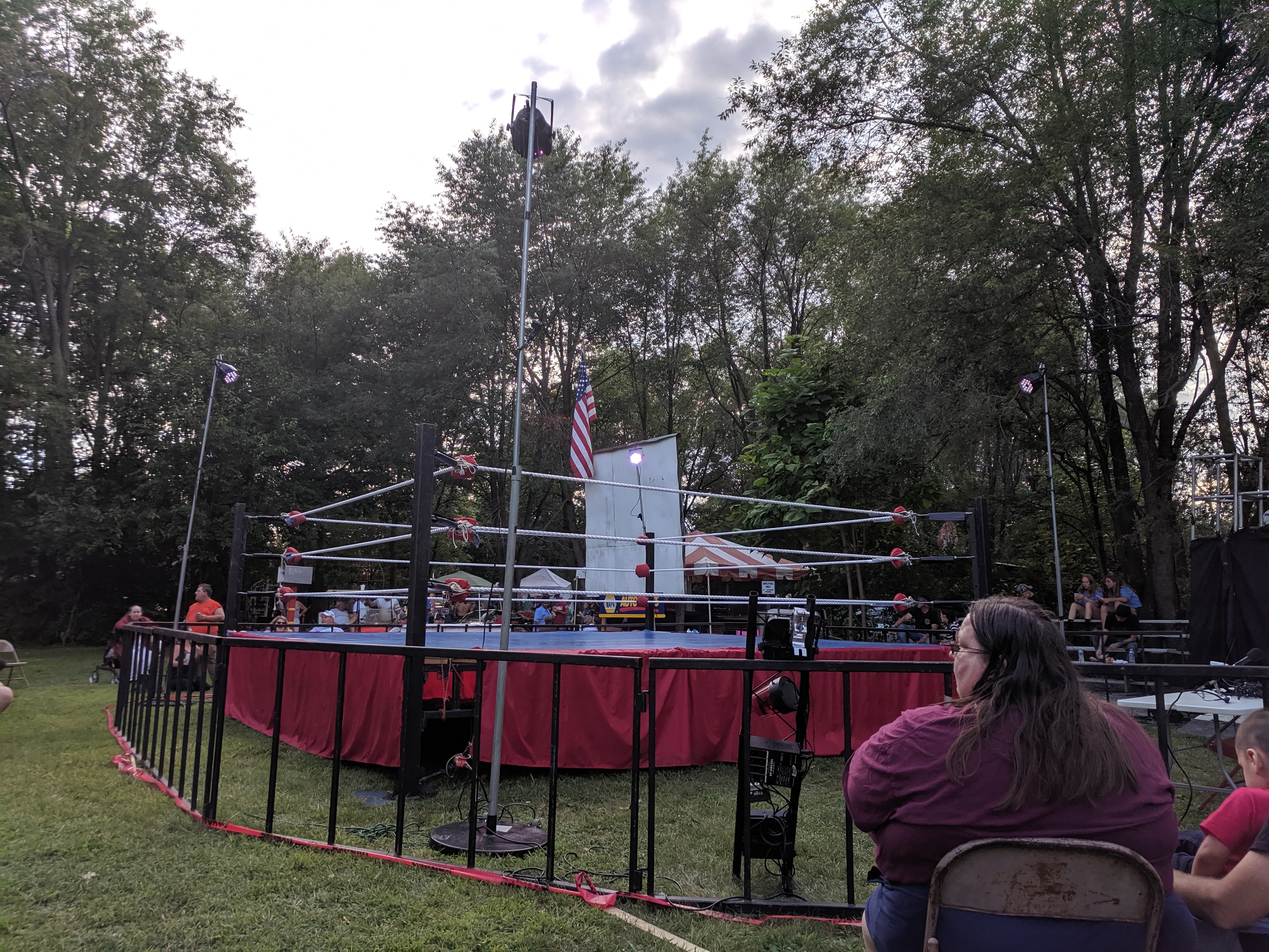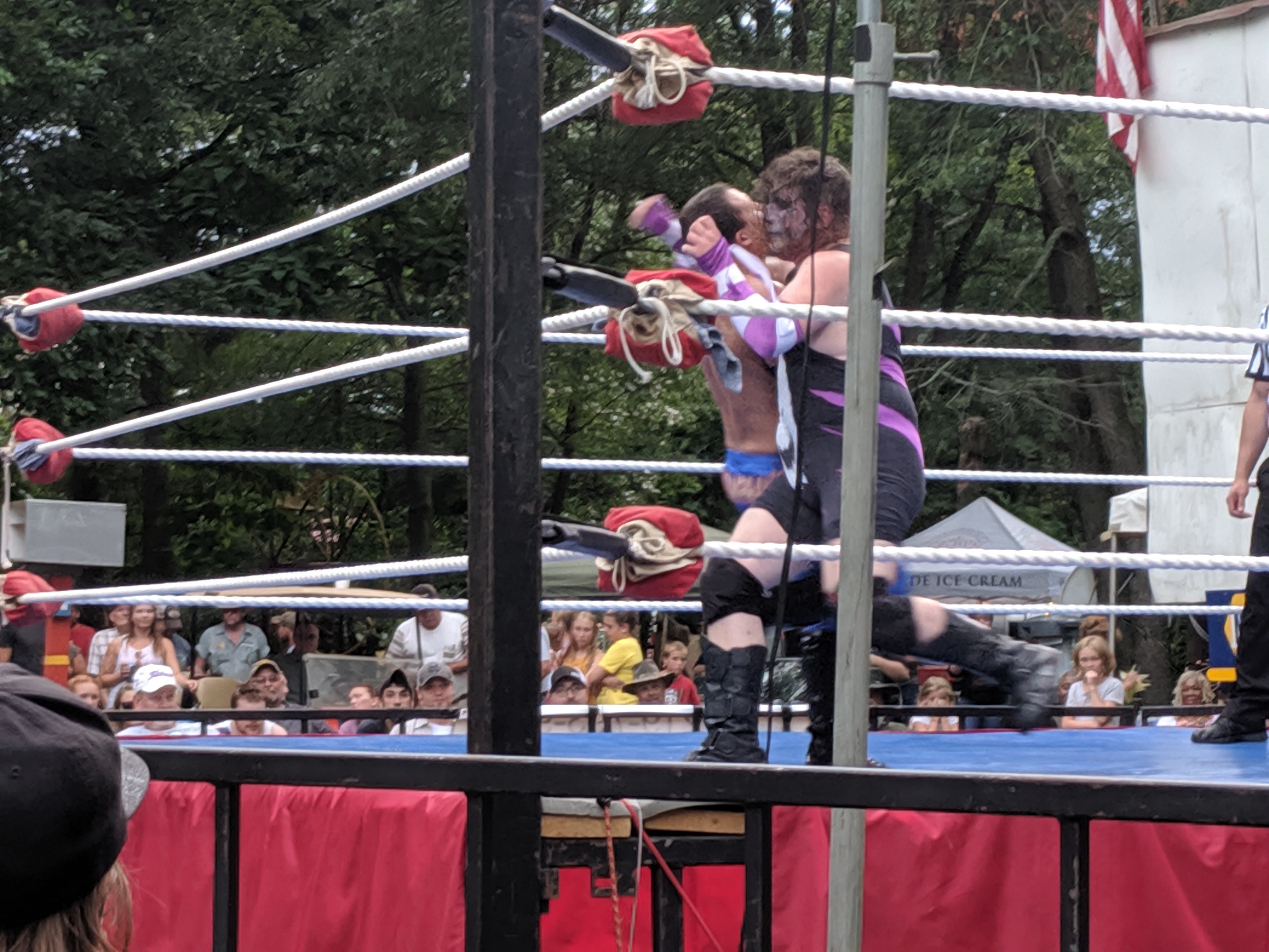 The Rust Belt Rebellion is an annual outdoor car show (and fun family event) that takes place in someone’s LARGE back yard property in Shelby IN. There are a couple of open fields where people bring in their well kept old cars, a small playground for kids, food & craft vendors, and this year a home-made ice cream stand! And then there is a field where ACW sets up their wrestling ring (the curtain and announce table are to my right in this picture).