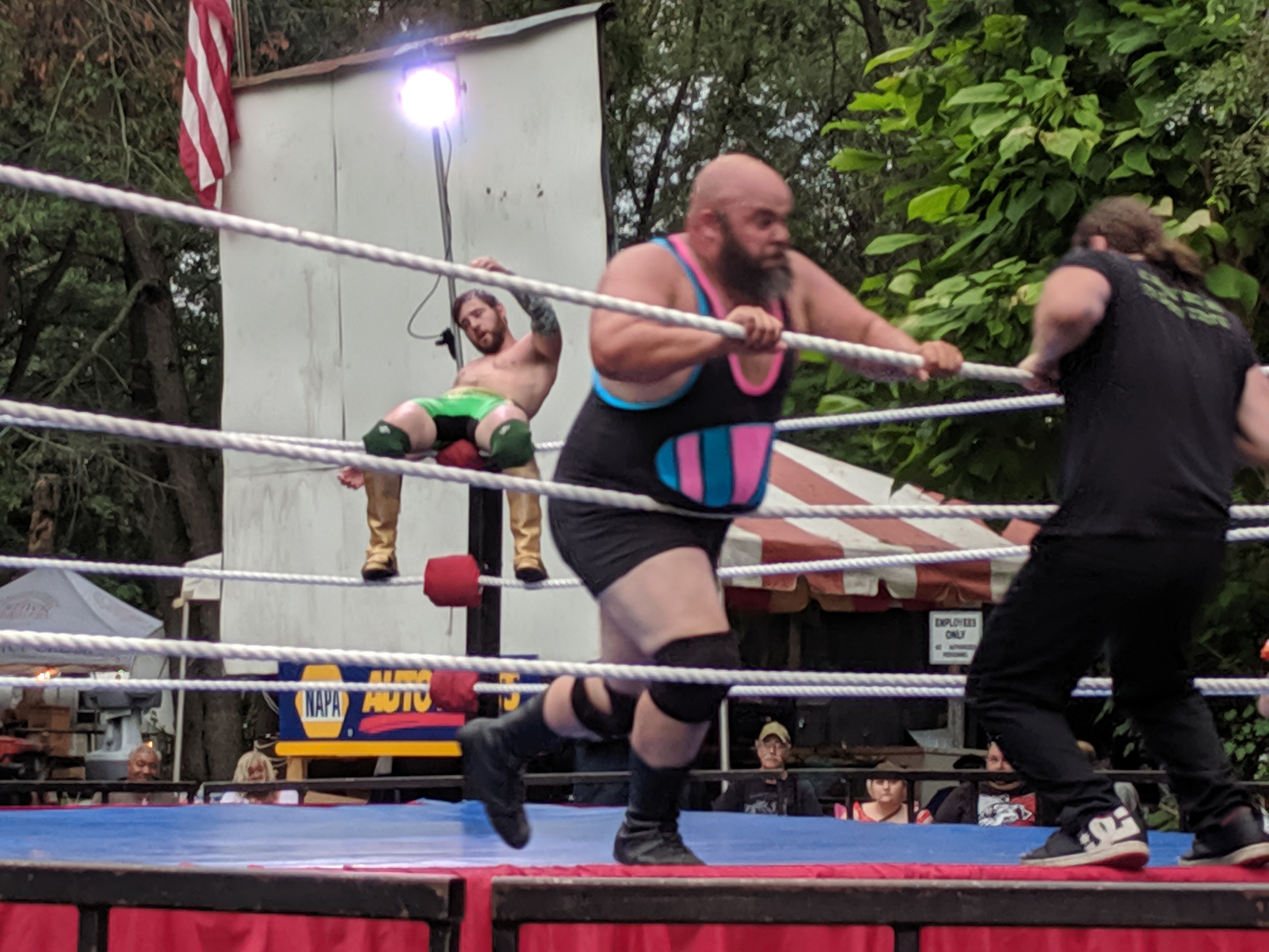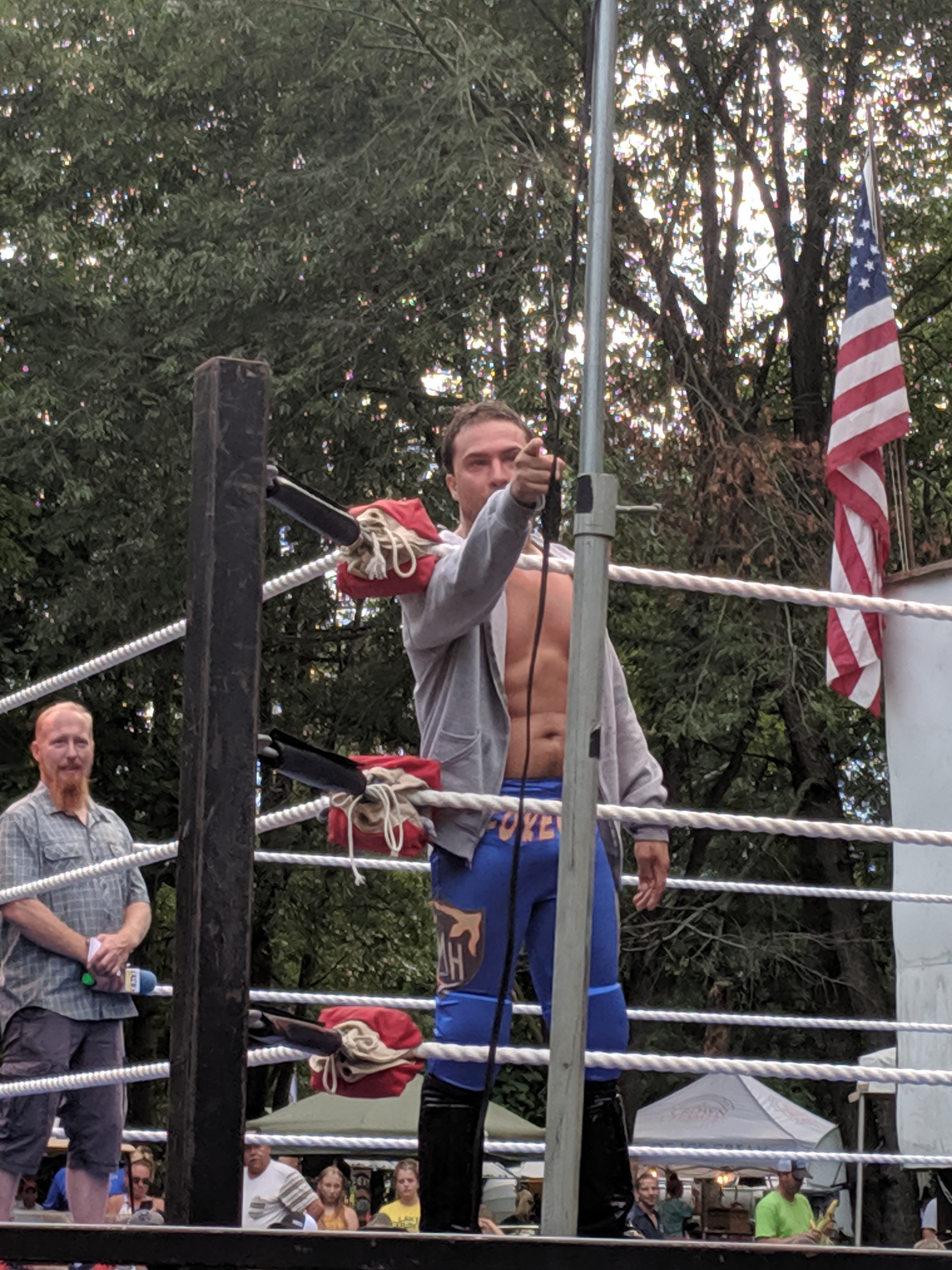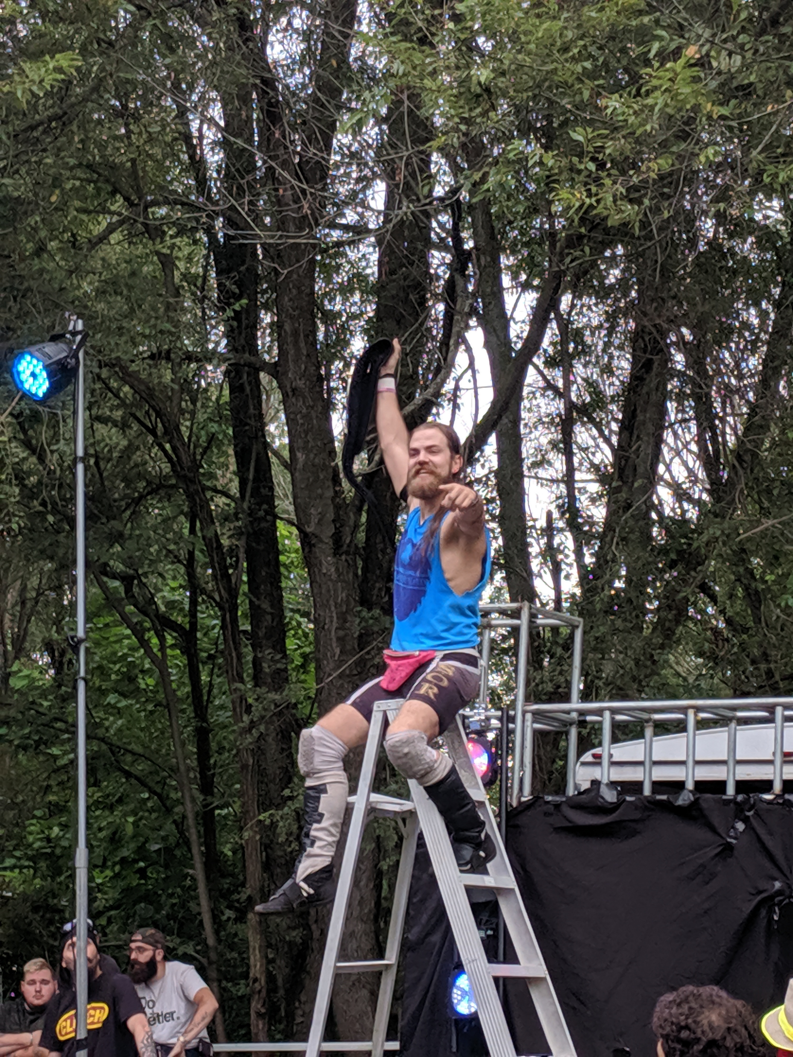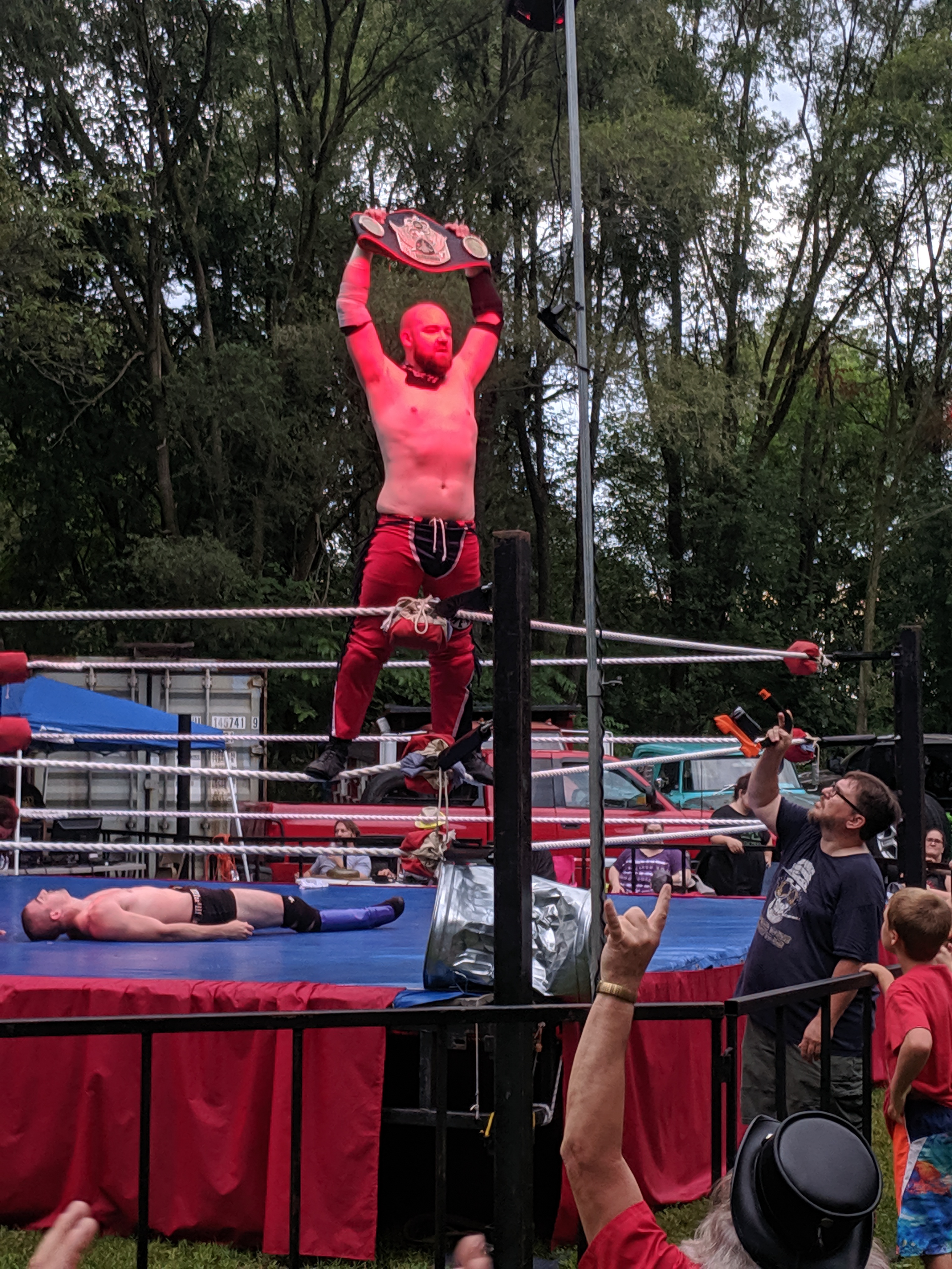 The fourth match was awesome, but I missed the best parts of it because most of the outside-the-ring action took place on the side opposite me, and I was too lazy to get up and walk around. (No, actually, I blame my chair – my folding lawn chair was broken, and so to get up, I had to move very carefully and delicately not to collapse it entirely … it wasn’t my laziness, it was my carefulness!). This fourth match was X Caliber vs Jared Kripke for the ACW Intercontinental Championship, held by Kripke. It was a Tables, Ladders, and Chairs match announced with a one hour time limit! It did not go that long, but two tables got destroyed – on the opposite side from me. During one crash through the tables, Jared Kripke gashed open his knee – and being the trooper he is, he went to the sound table to get a roll of duct tape to tape together his leg (see pic) … I imagine taking that tape off later would hurt more than the original injury, which (from info on Facebook later) took 10 stitches to close. Ouch! X Caliber won the match, and so is the new ACW Intercontinental Champ! And so now you can tell that the picture of Kripke on top of the ladder, holding his belt while smiling, was taken before the match started.