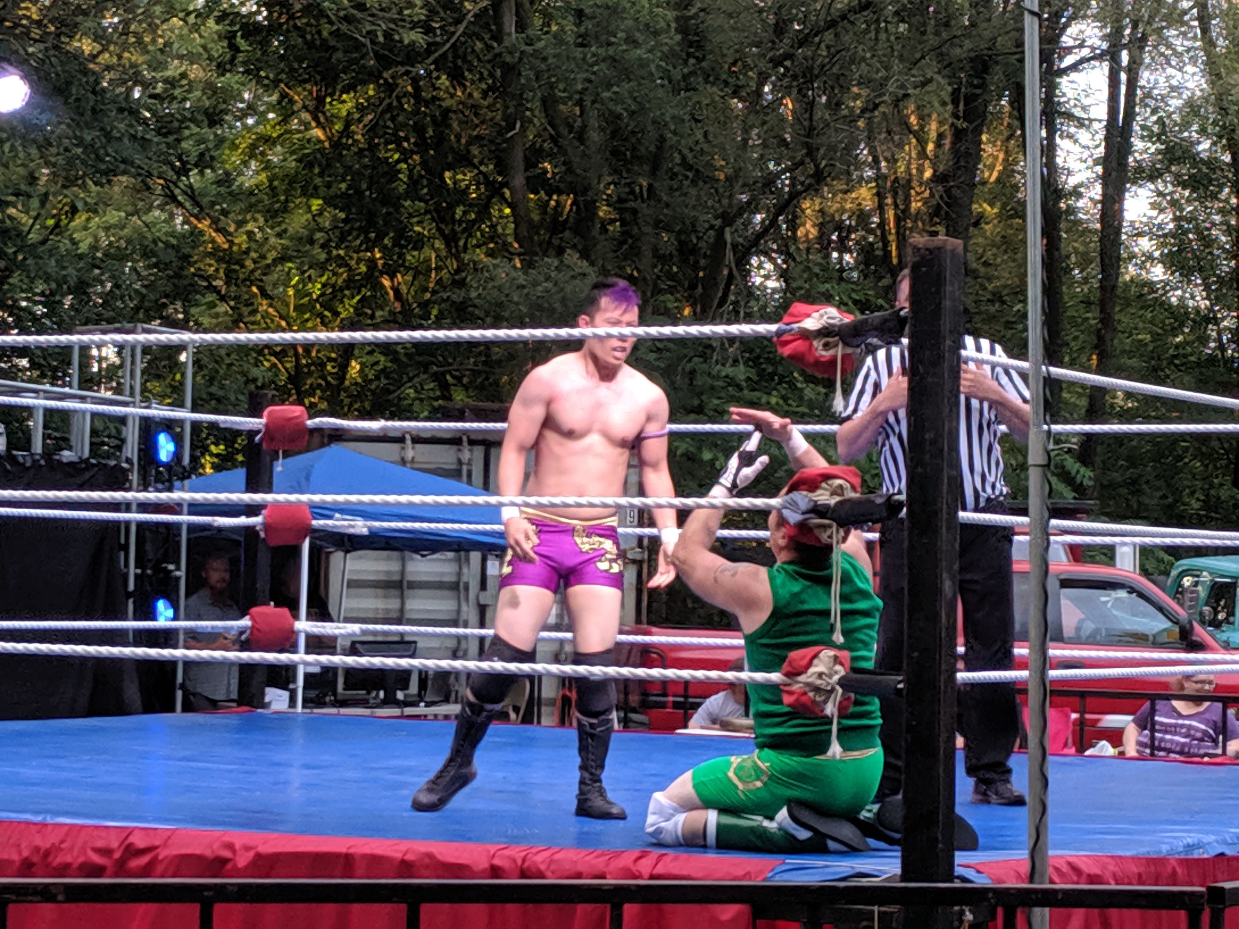 I don’t write this often, but Ref Zoran got one wrong! In the sixth match, Arun took on Brentley Alexander Dawson (BAD). At the end of the match, BAD took a foreign object out of his coat that was hanging on a ring post, and tried to hit Arun with it. He missed, and Arun capitalized to get the pin. But during the pin, BAD managed to slip the object into Arun’s waistband. When Arun stood up after the pin, Ref Zoran saw the object and reversed his decision, awarding the match to BAD. Booooo.