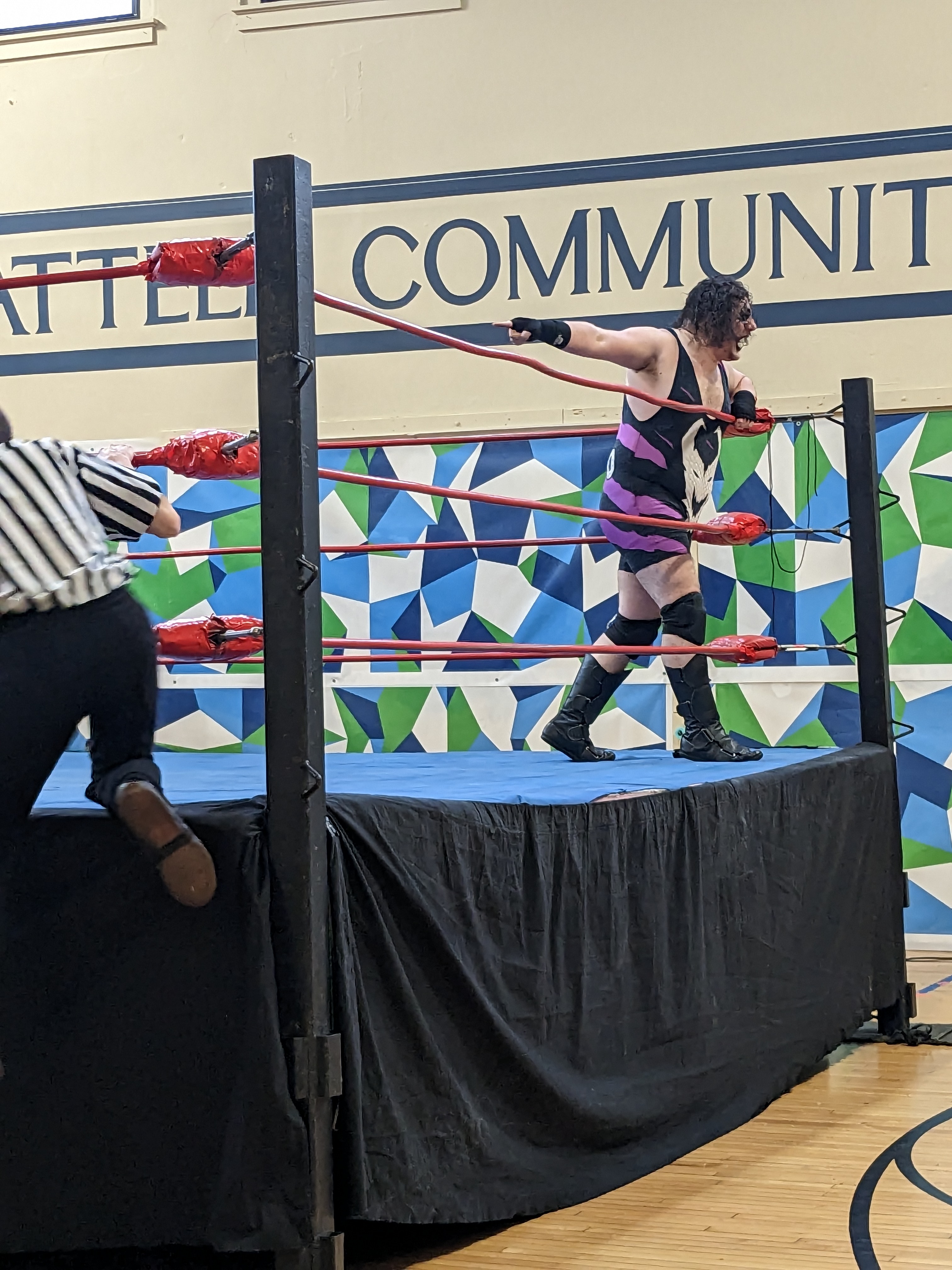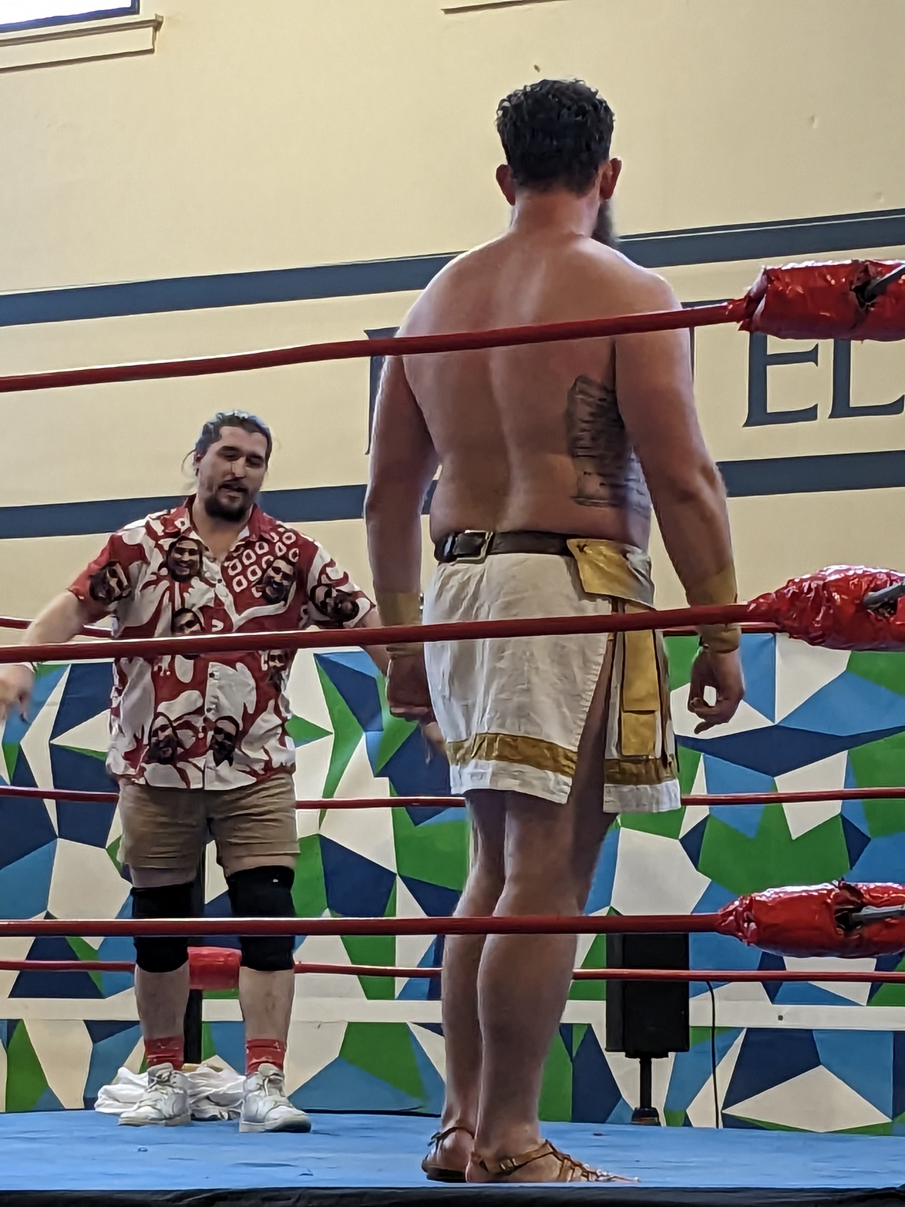 (I did not get a picture from this next match. Hey, I’m used to taking NO pictures, you’re lucky to get the ones that are here!) Match 4: Ritchie Rothchild is ready to defend his BBW Heavyweight Championship against an opponent of his own choosing! Ritchie says he is “The Monarch” of BBW, and thanks the crowd for sitting through other matches to get to see him. He is looking for an opponent bigger, stronger than all the rest. It’s Joey Rancid, Ritchie’s former partner! Joey comes out on fire. I think Ritchie may regret this. Joey keeps on the gas and eventually dropkicks Rothchild through the ropes. Eventually Ritchie does get some offense in, such as wrapping Joey’s arm around the ringpost and later a guillotine leg drop on the apron. Joey tries to fight back, but Ritchie stomps him into the mat. Rothchild follows that with a cynical, “Let’s here it for the challenger, guys!” soft-clapping prompt for the crowd. Joey finally remembers, “when in doubt, BITE!” and gnaws on Rothchild’s forehead, yum yum. Rancid has bandages on his fingers from a previous injury; Rothchild stomps them, then picks him up for a driver. After one more, Rothchild gets the pin, retaining his Backbreaker Wrestling Heavyweight Championship.